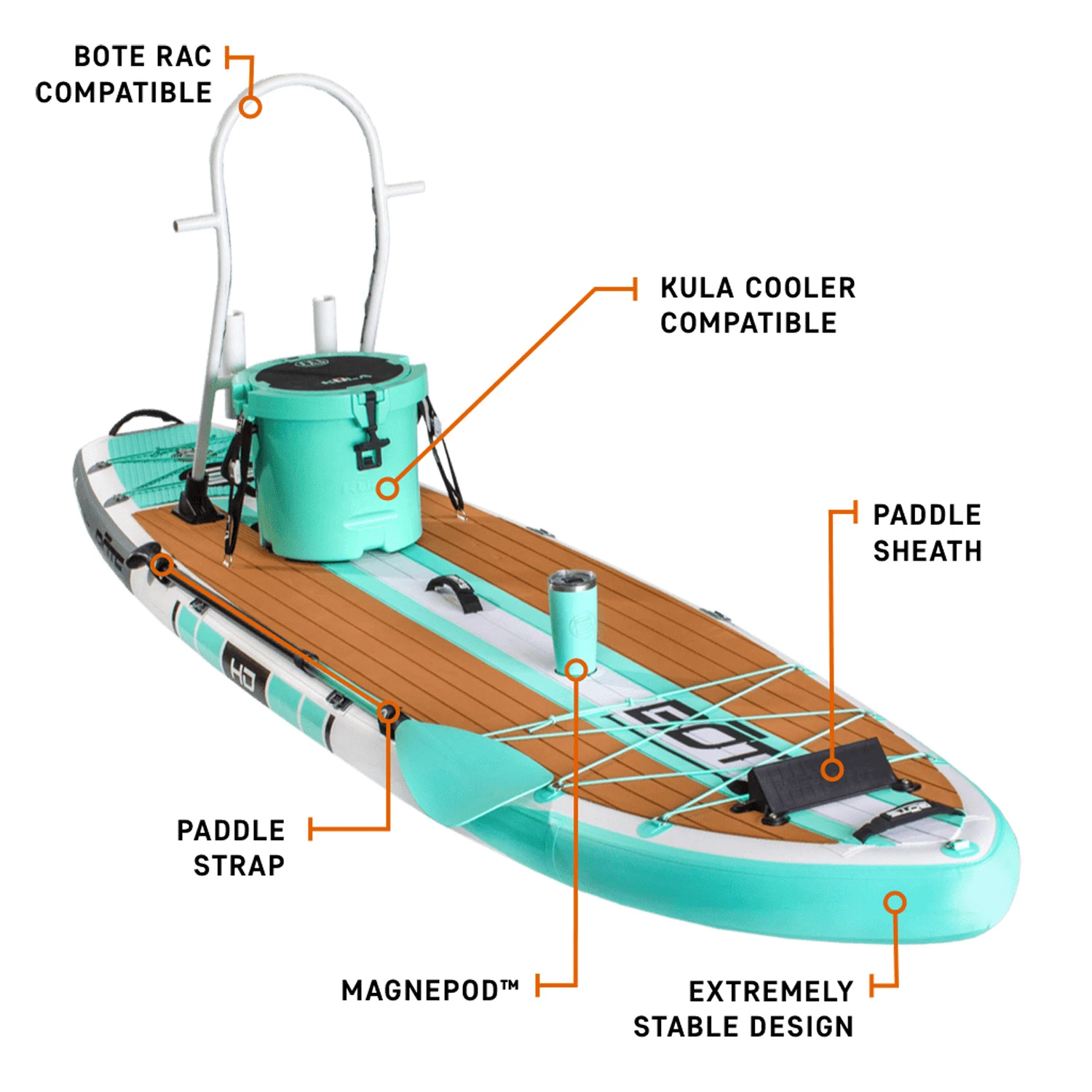 The HD Aero’s versatility is enhanced with the BOTE Rac System, KULA Cooler, and MAGNEPOD™ compatibility, making it perfect for fishing, exploration, or leisurely paddling. Additional features like Travelink™ carry sling compatibility, a paddle sheath, front and rear bungees, and integrated side bite fins ensure a smooth experience and convenience for solo trips or family outings.