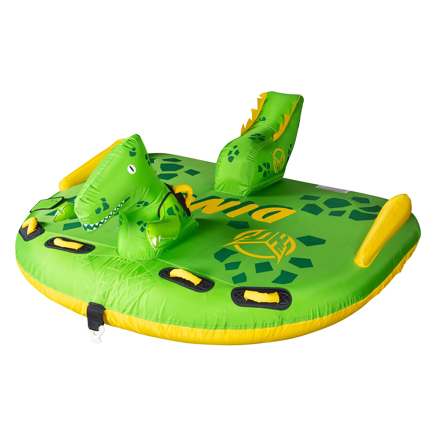 The Dino is a 3 rider towable tube built for fun days on the lake. The Dino can handle up to 3 riders but it can be ridden by 1, 2 or 3. The center rider sits on the deck of the tube while the outside riders lay in the prone position. Built with only the finest materials and guaranteed with our 1 year warranty, this tube will keep you where you want to be…on the water.