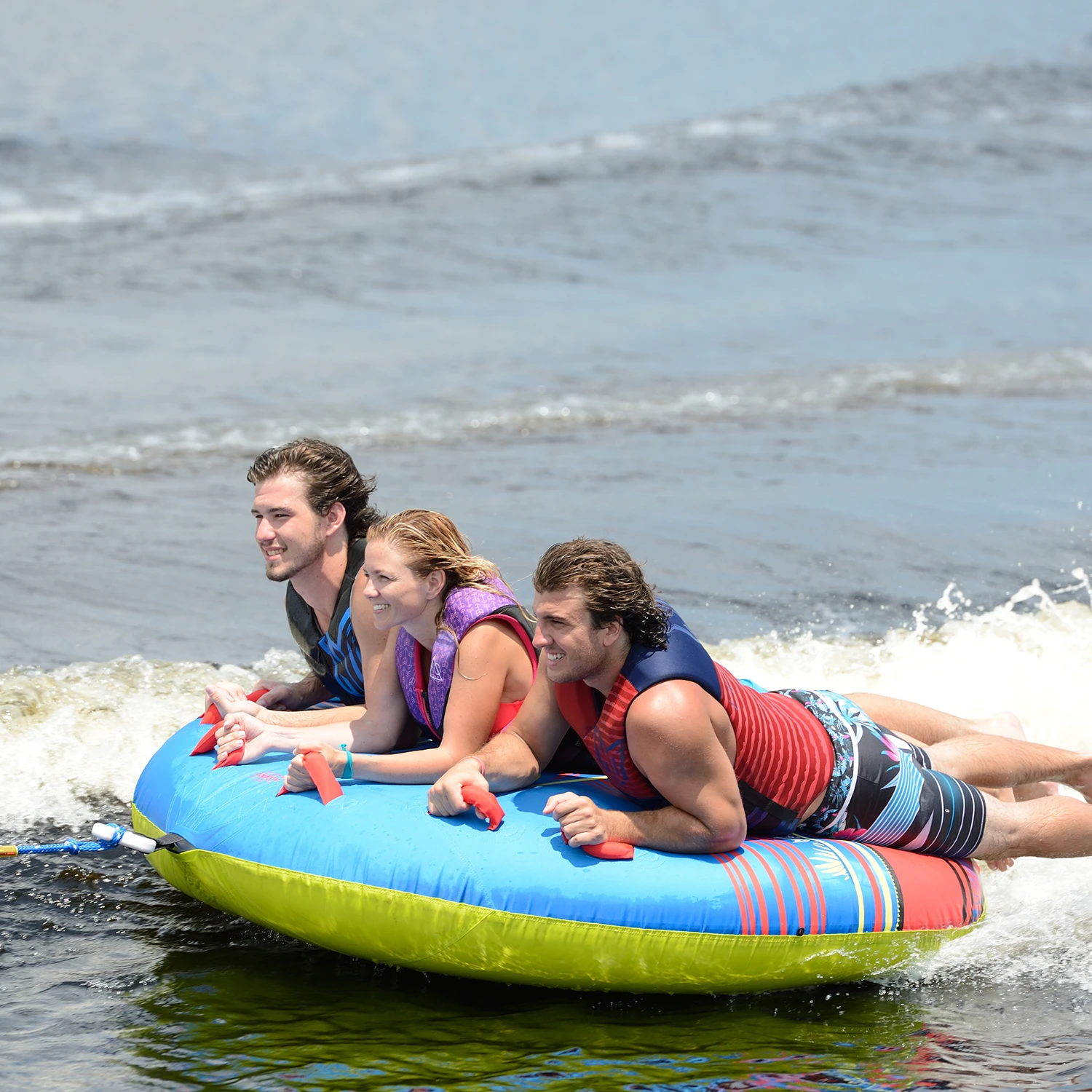 Traditionally, there has been very little difference between round, deck style tubes. You can buy one from any inflatable maker and they’re basically all the same. That is…until now. With the addition of HO Sports’ Shoftshell Technology, now you can tube all day without worrying about the abrasion or “tube rash” that you would get from a traditional nylon covered tube. This new technology is best thing to happen to tubes since the introduction of the nylon cover. So, grab a friend or two and hop aboard this 3 rider deck tube and have fun out there!