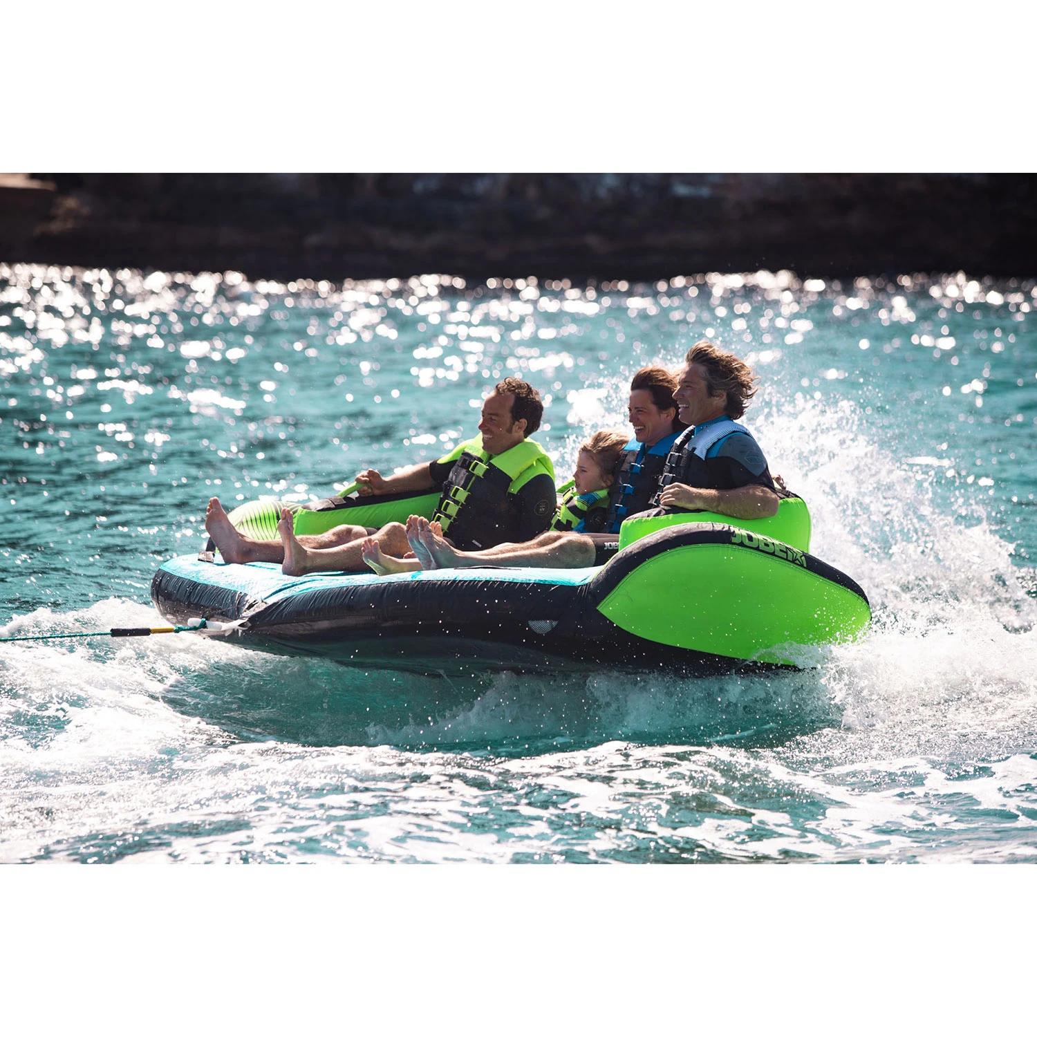 Find your way around the lake with the Sonar. This 4 person tube has two tow points for extreme fun. The Sonar is one of our luxurious 2-way towables with 2 different tow points to switch positions. Connect your rope easily with Jobe’s quick connector system and sit back to its comfy back support, or choose the wild side and go for a sporty kneeling position. This big boss is made out of 840D double- layered nylon and has 10 reinforced nylon-wrapped handles with soft and comfy knuckle protection.